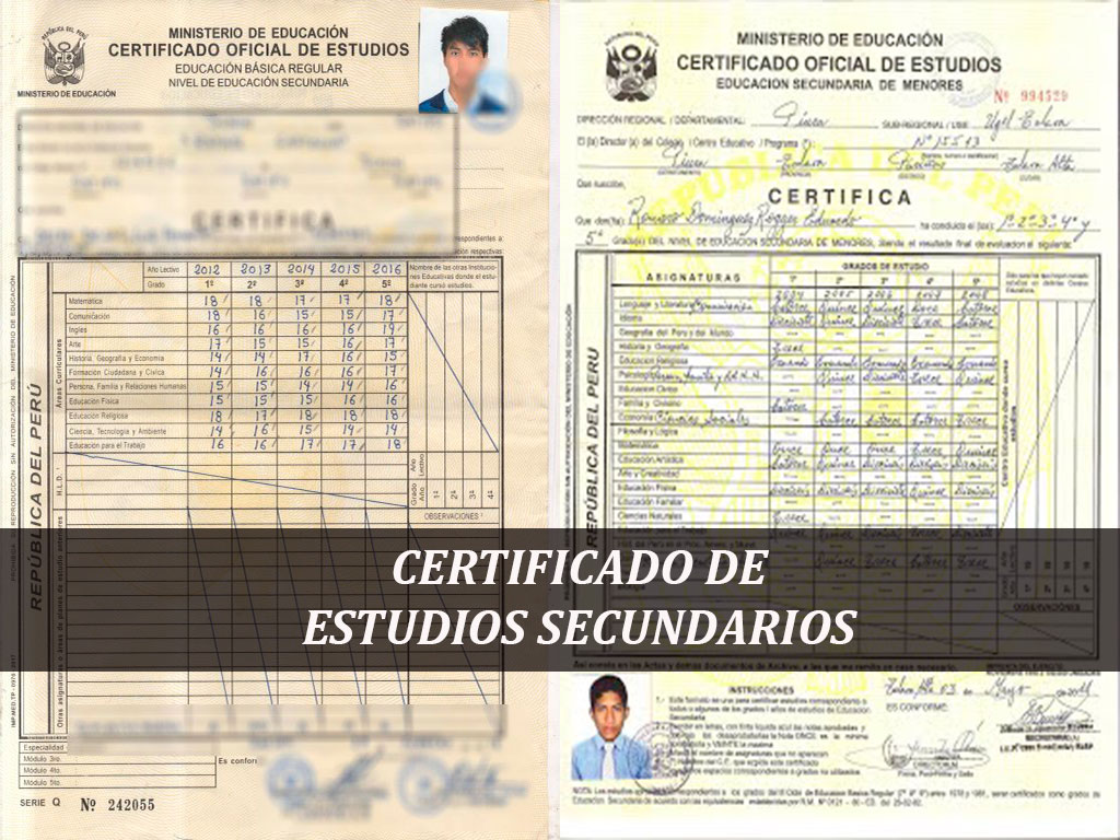 Un certificado de estudios es el documento que afirma que el estudiante ha cursado y aprobado con éxito todo el programa de enseñanza establecido para determinado nivel. En el caso de certificado de estudios secundarios se trata de la aprobación del primer hasta el quinto grado de secundaria.