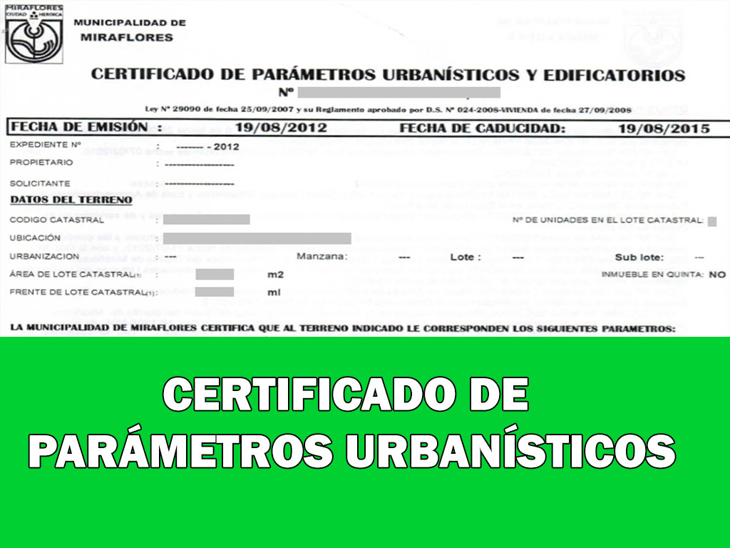 El certificado de parámetros urbanístico, es un documento emitido por las municipalidades en Lima, en donde dice cuáles son los parámetros para construir un predio, tiene un plazo de 36 meses a partir de la fecha en que fue emitida.